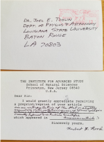 "Dear Herbert: Your recent request for reprints of my work on the non-Newtonian Force Law came as a bit of a shock. I was, until then, unaware that Vera had mentioned my work in her article — in fact, that issue of Scientific American only arrived to subscribers here at LSU the day that your request for reprints appeared in my mailbox." |